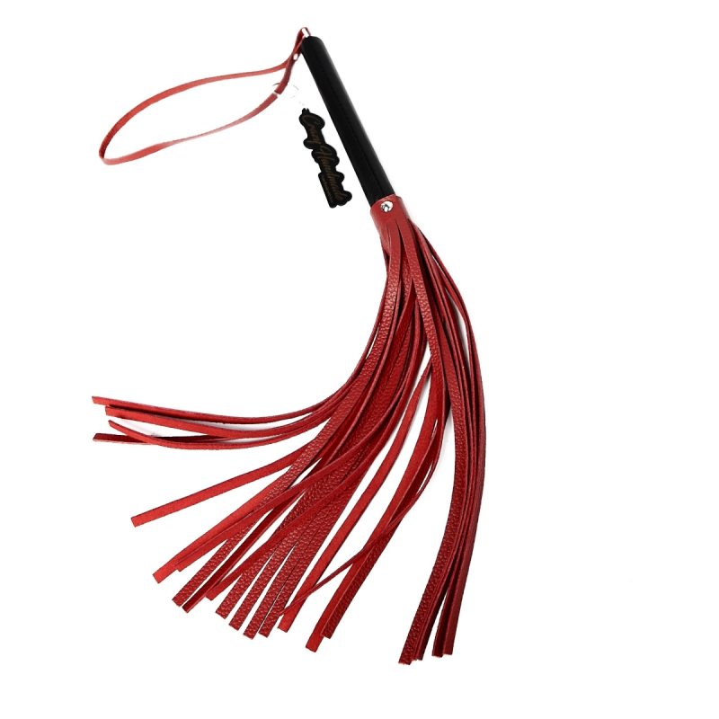 Удобная многохвостная плеть выполнена из натуральной кожи в красном цвете с контрастной черной ручкой